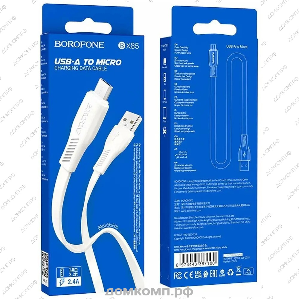 Кабель Borofone BX85 microUSB - USB это качественный фирменный продукт, подходящий для зарядки батареи телефонов и планшетов всех производителей, а также их синхронизации с любым другим компьютерным устройством для обмена данными. Имея современную конструкцию он изготавливается из наиболее долговечных материалов. Оплетка провода состоит из ткани и алюминиевого сплава повышенной гибкости и прочности, для предотвращение изломов и трещин в условиях постоянной эксплуатации. Проводники достаточно большого сечения имеют многожильную структуру, каждая составляющая которой вытянута из цельного куска качественной меди и дополнительно укреплены токами высокой частоты. Коннекторы получили оригинальную усиленную конструкцию, предотвращающую коррозию соединений и поломку разъемов при изгибах. С одной стороны девайса имеется классический разъем micro USB Тип B, гнездо для которого есть у многих современных телефонов и планшетов Samsung, Redmi или Xiaomi, а также у любого переносного внешнего аккумулятора. С другого конца кабеля находится стандартный коннектор USB Тип A, который подойдет к компьютеру, ноутбуку, мобильному аккумулятору или зарядному устройству.